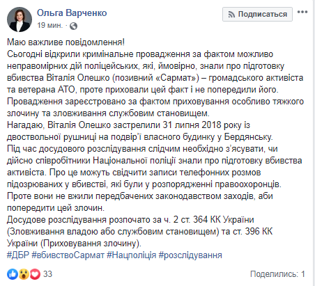 "Сегодня открыли уголовное производство по факту возможно неправомерных действий полицейских, которые, вероятно, знали о подготовке убийства Виталия Олешко (позывной "Сармат") - общественного активиста и ветерана АТО, однако скрыли этот факт и не предупредили его", - написала Варченко.