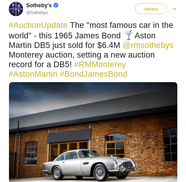 "Самый знаменитый автомобиль в мире - Aston Martin DB5 1965 года - только что продан за 6,4 млн долларов. Аукцион Sotheby's в Монтерее установил новый рекорд для модели DB5",  говорится в сообщении аукционного дома в Twitter.