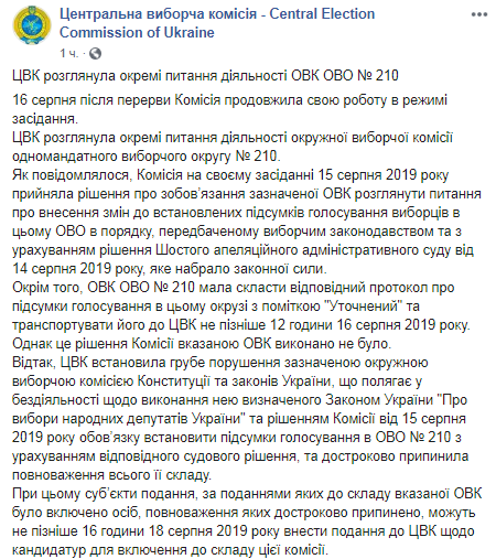 "Следовательно, ЦИК установила грубое нарушение указанной окружной избирательной комиссией Конституции и законов Украины, которое заключается в бездействии по выполнению им определенного Законом Украины "О выборах народных депутатов Украины" и решением Комиссии от 15 августа 2019 обязанности установить итоги голосования в ОВО № 210 с учетом соответствующего судебного решения, и досрочно прекратила полномочия всего ее состава", - сказано в сообщении.