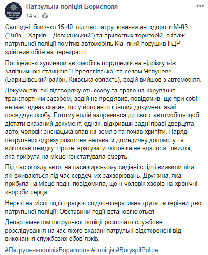 В воскресенье, 18 августа, в районе Борисполя патрульные остановили авто, водитель которого нарушил ПДД, однако мужчине стало плохо и он умер. Об этом сообщает пресс-служба Патрульной полиции Борисполя в Facebook.