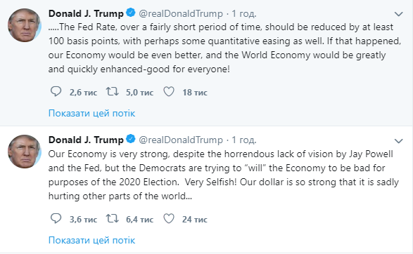 "Наша экономика очень сильна, несмотря на ужасающую недальновидность Джея Пауэлла (Джером Пауэлл, глава ФРС - ИФ) и Федрезерва, но демократы стараются ухудшить экономику специально к выборам 2020 года. Очень эгоистично!", - написал Трамп в соцсети Twitter.
