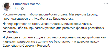 Президент Франции Эмманюэль Макрон написал пост в Facebook на русском языке, отметив, что верит в Европу, которая простирается от Лиссабона до Владивостока.