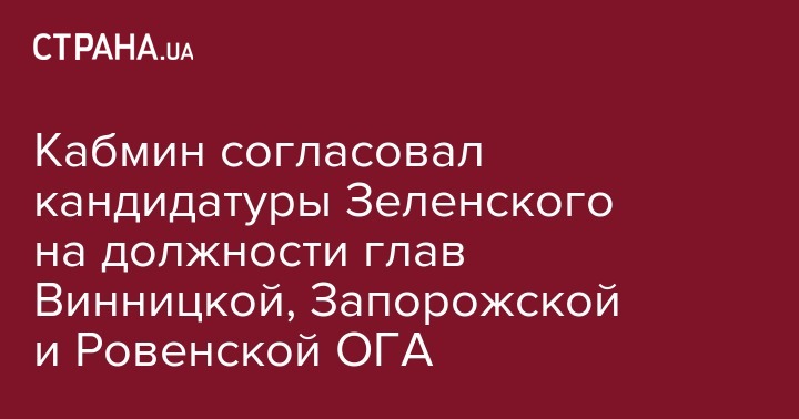 Кабинет министров Украины в среду согласовал предложенные президентом Украины Владимиром Зеленским кандидатуры на должности глав Винницкой, Запорожской и Ровенской облгосадминистраций, передает "Интерфакс-Украина".