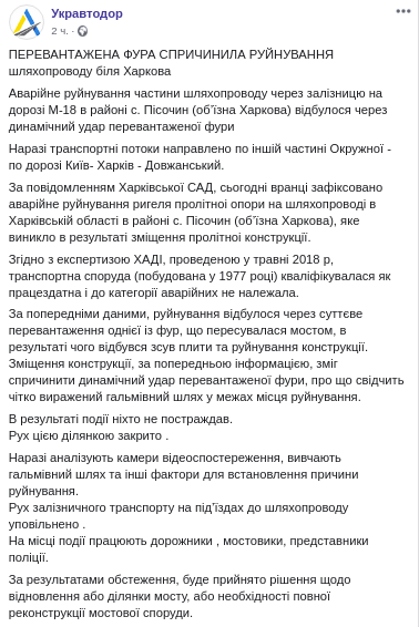 В "Укравтодоре" отмечают, что согласно экспертизе Харьковского автодорожного института, проведенной в мае 2018 года, мост, (построенный в 1977 году) квалифицировался как работоспособный и к категории аварийных не относился. Сейчас анализируются камеры видеонаблюдения, изучается тормозной путь и другие факторы для окончательного установления причины разрушения.