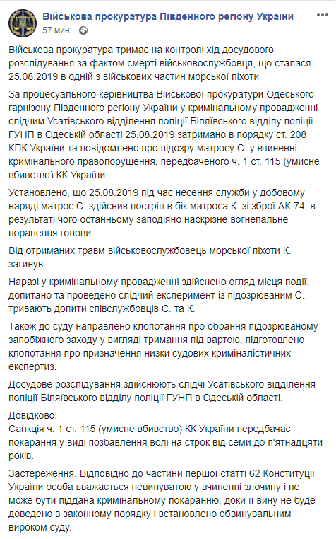 "Установлено, что 25.08.2019 во время несения службы в суточном наряде матрос С. осуществил выстрел в сторону матроса К. из оружия АК-74, в результате чего последний получил сквозное огнестрельное ранение головы. От полученных травм военнослужащий морской пехоты К. погиб", - сообщила Военная прокуратура Южного региона Украины на странице в соцсети Фейсбук.