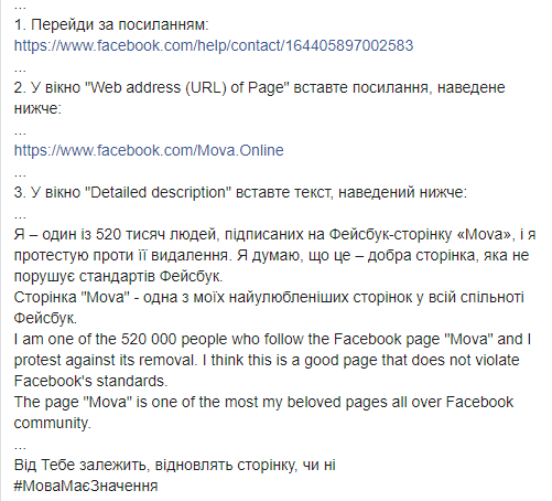"Паблик "Mova" заблокирован! 520 000 подписчиков - одну из крупнейших проукраинских патриотических страниц во всем украинском сегменте Facebook заблокировали!", - говорится в сообщении. Активист просит всех неравнодушных обжаловать такие действия в службе поддержки Facebook.
