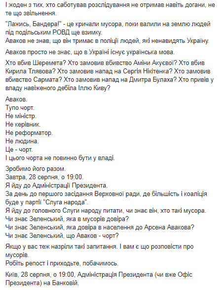 В среду, 28 августа, у здания Офиса президента на Банковой состоится акция протеста против министра внутренних дел Арсена Авакова. Об этом в Facebook написал блогер Роман Синицын.