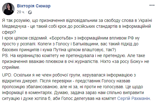 "Я так понимаю, что назначение ответственным за свободу слова в Украине Медведчука - это некий шаг к российским стандартам в информационной сфере? И шаг вполне сознательный. "Борьба" с информационным воздействием РФ ну просто в разгаре. Коллеги из Голоса и Батькивщины, вас такой подход к базовым принципам и кума Путина вполне устраивает, да?)