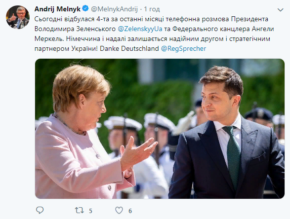 "Сегодня состоялась 4-я за последние месяцы телефонный разговор президента Владимира Зеленского и Федерального канцлера Ангелы Меркель. Германия продолжает оставаться надежным другом и стратегическим партнером Украины!", - написал Мельник в своем микроблоге в соцсети Twitter.