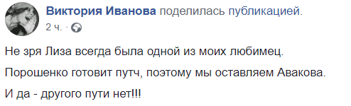 "Не зря Лиза всегда была одной из моих любимиц. Порошенко готовит путч, поэтому мы оставляем Авакова. И да - другого пути нет!", - иронизирует блогер Виктория Иванова.