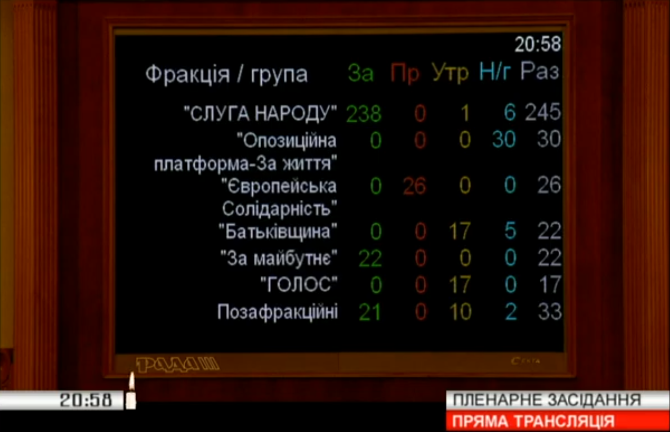 Так, от "Слуги народа" "за" проголосовали 238 депутатов, от "За будущее" - 22 и 21 со стороны внефрационных парламентариев. При этом представители "Оппозиционной платформы - за жизнь", "Европейской солидарности", "Батькивщины" и Голоса предпочли не голосовать или воздержаться.