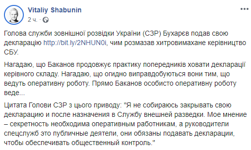"Председатель Службы внешней разведки Украины (СВР) Бухарев подал свою декларацию, чем размазал хитромудрое руководство СБУ. Напомню, что Баканов (новый глава СБУ - Ред.) продолжает практику предшественников прятать декларации руководящего состава. Напомню, что противно оправдываются они тем, что ведут оперативную работу. Прямо Баканов лично оперативную работу ведет", - написал Шабунин.