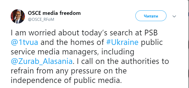 Представитель ОБСЕ по вопросам свободы СМИ Арлем Дезир высказал обеспокоенность из-за сообщения об обысках в офисе Национальной общественной телерадиокомпании Украины, а также в квартире председателя правления НСТУ Зураба Аласании. Об этом он написал в Twitter.