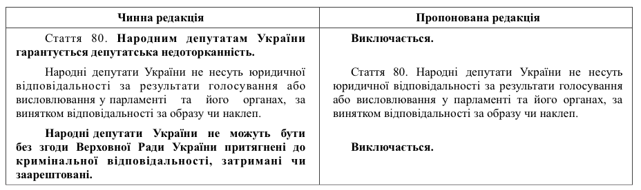 Из Основного закона убрали фразу, что депутатам гарантируется неприкосновенность. А также, что нардепы не могут быть привлечены к уголовной ответственности или задержаны без согласия Рады.