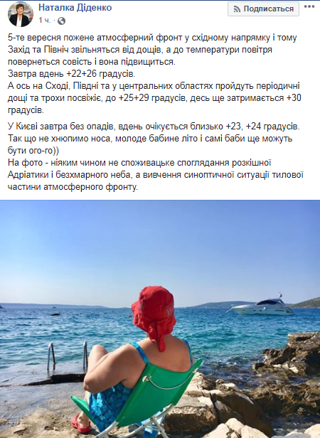 "В Киеве завтра без осадков, днем ​​ожидается около +23, +24 градусов. Так что не вешаем нос, молодое бабье лето и сами бабы еще могут быть ого-го", - написала Наталья Диденко.