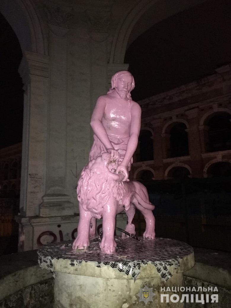 Полиция задержала троих молодых людей, которые покрасили в ярко розовый цвет скульптуру-фонтан "Самсон" на Контрактовой площади в Киеве. Об этом сообщается на сайте столичной Нацполиции.