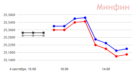 По состоянию на 17:30: покупка 25,16 грн, продажа 25,20 грн. То есть за день курс остался практически без изменений.