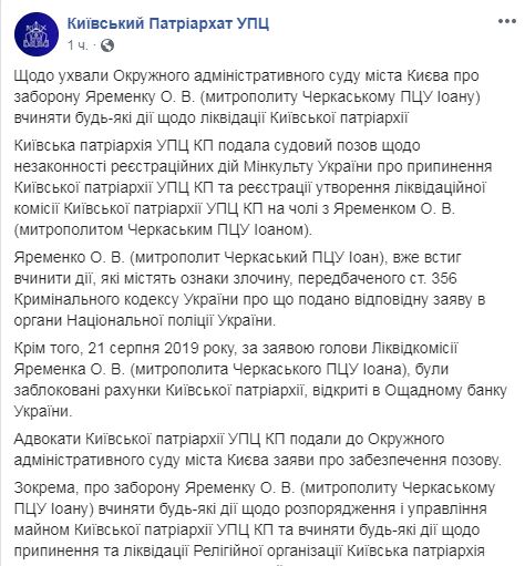 В УПЦ КП напомнили, что ранее по заявлению митрополита Иоанна "были заблокированы счета Киевской патриархии, открытые в Сберегательном банке Украины". После решения суда, пояснили в церкви, ему "запрещено совершать любые действия по распоряжению и управлению имуществом Киевской патриархии УПЦ КП и совершать любые действия по прекращению и ликвидации религиозной организации".