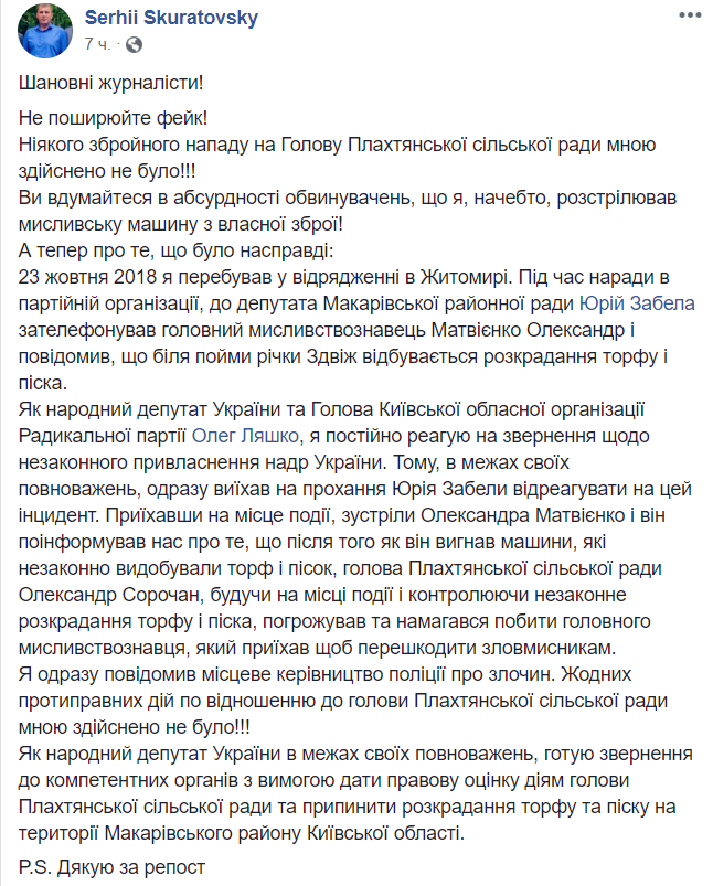 Об этом же заявил и его сопартиец Андрей Лозовой: "Сергей Скуратовский не принимал участия в охоте, он возвращался из командировки с нашим руководителем. Он был в костюме. Я поинтересовался у людей – ночью на фазана не охотится никто. Это инсинуация. Потому что если бы хотели их побить, то прибили бы там. И они, в принципе, это заслужили. Это низкопробный фейк, которым занимается председатель Плахотнюк, или как там его, который безбожно ворует у украинского народа торф, песок – мы обнародуем доказательства", - заявил заместитель руководителя Радикальной партии.