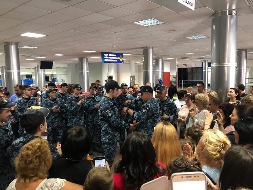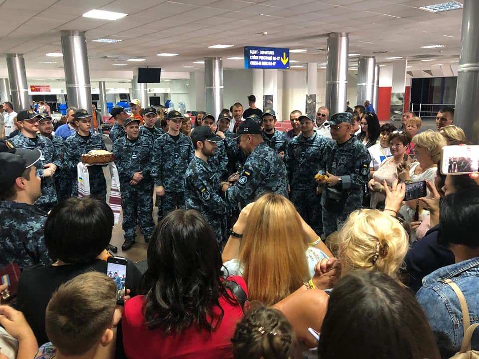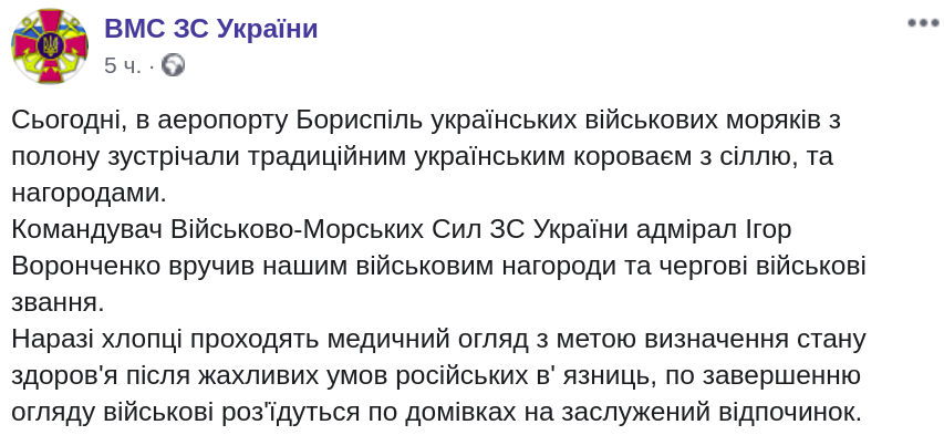 "Сегодня, в аэропорту Борисполь украинских военных моряков из плена встречали традиционным украинским караваем с солью, и наградами. Командующий ВМС ВС Украины адмирал Игорь Воронченко вручил нашим военным награды и очередные воинские звания", - говорится в сообщении.