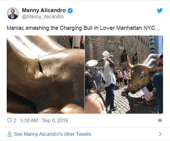 Вчера, 7 сентября, в Нью-Йорке произошло знаковое ЧП. 42-летний Тевон Варлак из Далласа повредил бронзовую статую "Атакующего быка" на Уолл-стрит.
