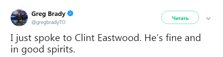 Однако некоторые отнеслись к известию скептически. А вскоре последовали опровержения утки. Так, известный на Западе радиоведущий Грег Брэйди написал в Twitter, что недавно разговаривал с Клинтом. Брейди подтвердил, что на самом деле Иствуд жив и здоров.