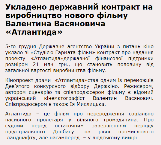 "Атлантида - это фильм о перерождении социально пассивного пролетария в свободного гражданина. О судорогах перед окончательным завершением периода индустриального Донбасса: на уровне промышленного ландшафта, но прежде всего - в человеческом измерении", - описывается сюжет фильма на сайте ведомства.