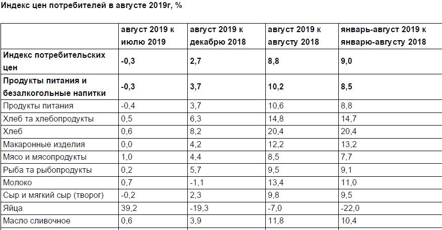 Потребительские цены в Украине после падения в июле 2019 года на 0,6% в августе снизились еще на 0,3%, а в годовом измерении (август 2019 года к августу 2018 года) инфляция достигла 8,8%.