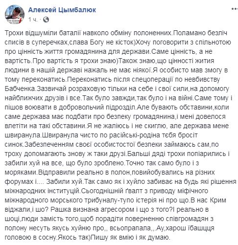 "Большие дяди немного попиарились и забили х@@ на все, что было сделано. Точно так же было и с моряками.Отправили реально в плен, повыйобувались на разных форумах и.... Забили х@@. Так же как и х@@@о забивает на любые решения международных институтов. Сегодняшний шум по поводу мифического международного морского трибунала-тупо истерия ни о чем. У нас Крым отжали, и шо? Рашка признана агрессором и что с того? И реально в шоке, люди вместо того,чтобы порадоваться возвращению сограждан из плена несут какую-то ху@@ю о "всепропало", - отметил Цымбалюк.