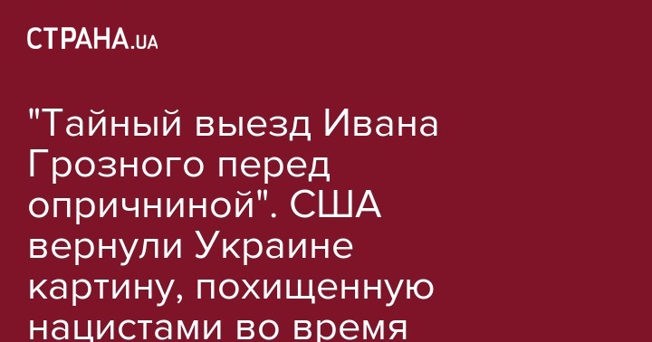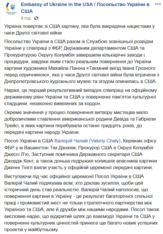 "Посольство Украины в США вместе со Службой внешней разведки Украины и в сотрудничестве с ФБР, Государственным департаментом США и прокуратурой округа Колумбия завершили многолетние мероприятия и процедуры, благодаря которым стало реальным возвращение в Украину картины художника Михаила Панина "Тайный выезд Ивана Грозного перед опричниной", которая в время Второй мировой войны была похищена из Днепропетровского художественного музея и впоследствии оказалась в США.