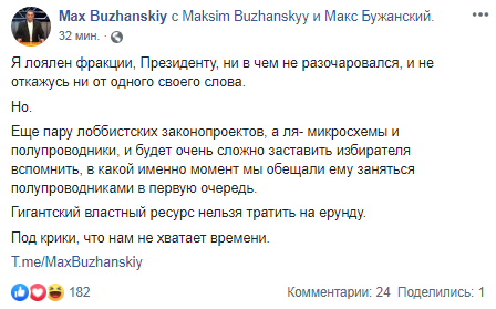 "Я лоялен фракции, президенту, ни в чем не разочаровался, и не откажусь ни от одного своего слова. Но. Еще пару лоббистских законопроектов, а-ля микросхемы и полупроводники, и будет очень сложно заставить избирателя вспомнить, в какой именно момент мы обещали ему заняться полупроводниками в первую очередь. Гигантский властный ресурс нельзя тратить на ерунду. Под крики, что нам не хватает времени", - написал Бужанский.