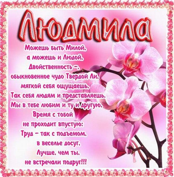 С именинами, Люда! Пусть небо твоей жизни будет голубым и безоблачным с ярким солнцем, надежным тылом, дружеским теплом и любовью близких. Будь здоровой, пусть глаза светятся от счастья, а душа и сердце остаются всегда юными!