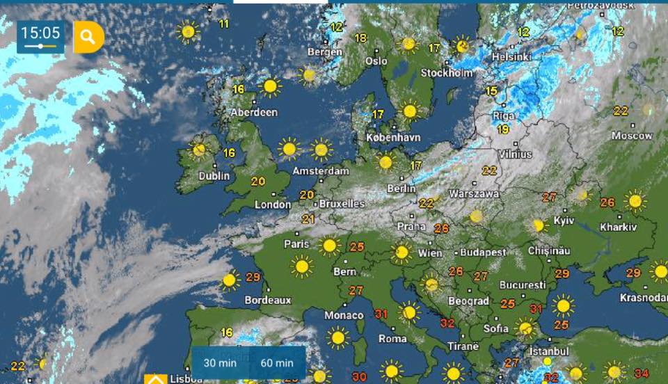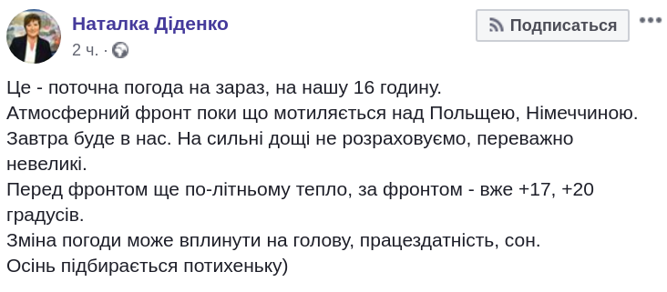 "Атмосферный фронт пока болтается над Польшей, Германией. Завтра будет у нас. На сильные дожди не рассчитываем, преимущественно небольшие. Перед фронтом еще по-летнему тепло, за фронтом - уже +17, +20 градусов" - написала Диденко комментарий к карте.