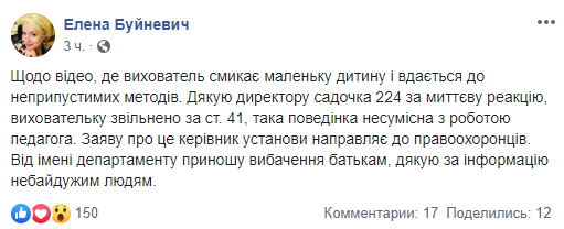 Всего через час после этого директор департамента науки и образования Одесского горсовета Елена Буйневич сообщила на своей странице в Facebook, что директор детского сада уволила горе-воспитательницу. Она также отметила, что при этом в полицию направили соответствующее заявление.