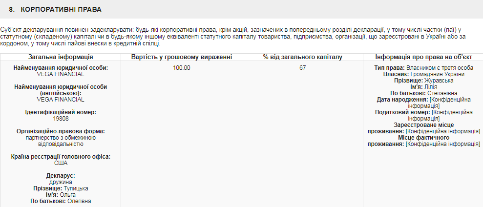 Еще судья КСУ Тупицкий задекларировал, что его жена владеет долей 67% в неком партнерстве с ограниченной ответственностью "VEGA FINANCIAL" из США: