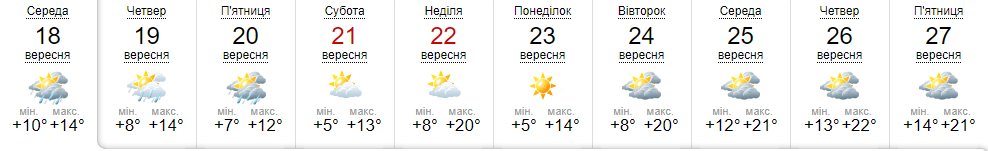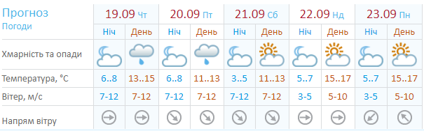 19 сентября дожди будут преобладать в северо-западной части Украины (Ровно, Луцк, Львов, Ивано-Франковск, Ужгород, Тернополь, Чернигов и Киев). 20 сентября дожди продвинутся к центру, непогода захватит Сумы, Полтаву, Харьков, Днепр.