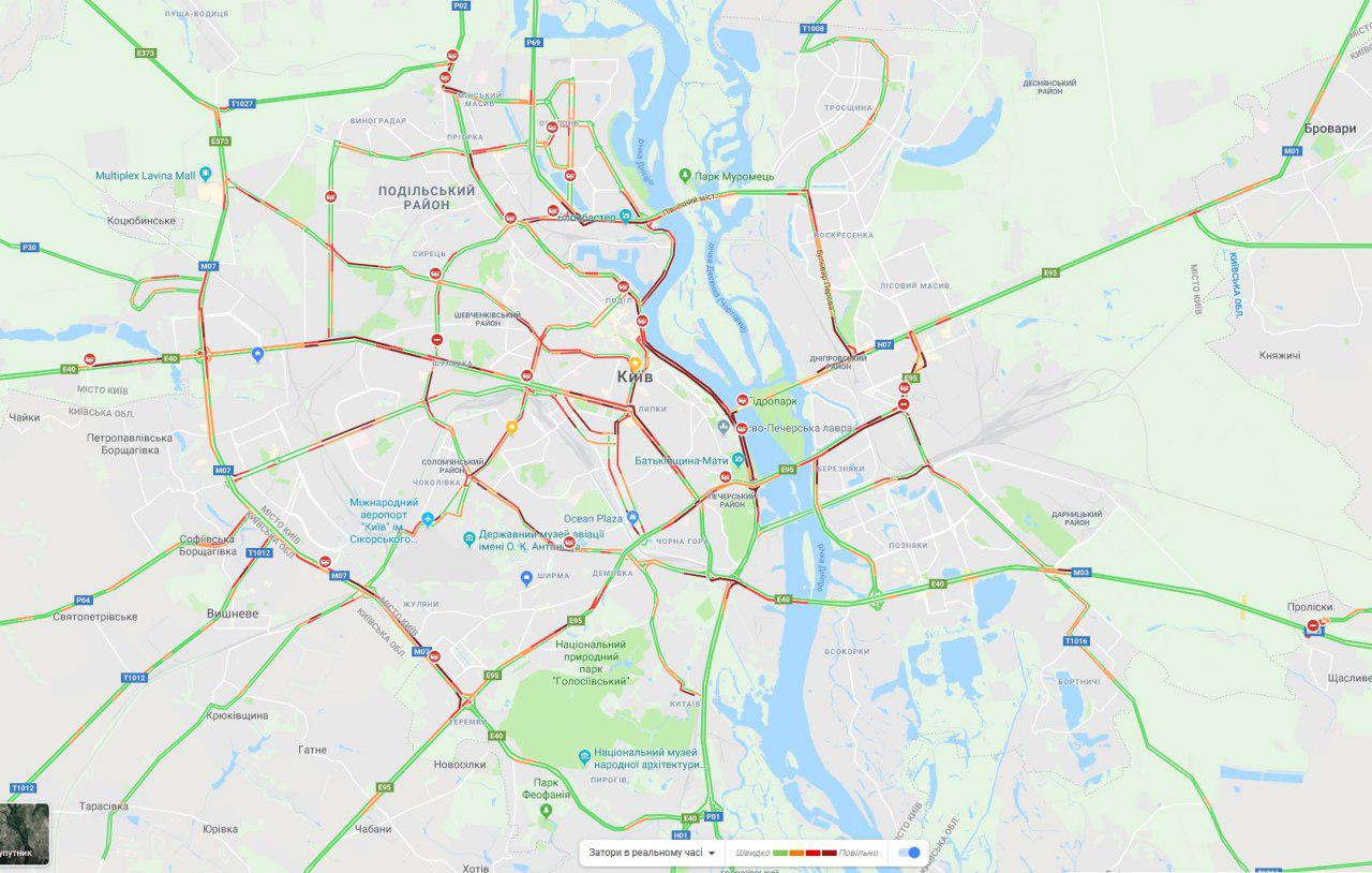 Причиной гигантских заторов стало закрытие моста Метро из-за угрозы взрыва. Полиция полностью ограничила движение на мосту, из-за чего сразу неподвижно стали улица Набережно-Крещатицкая и Броварской проспект.