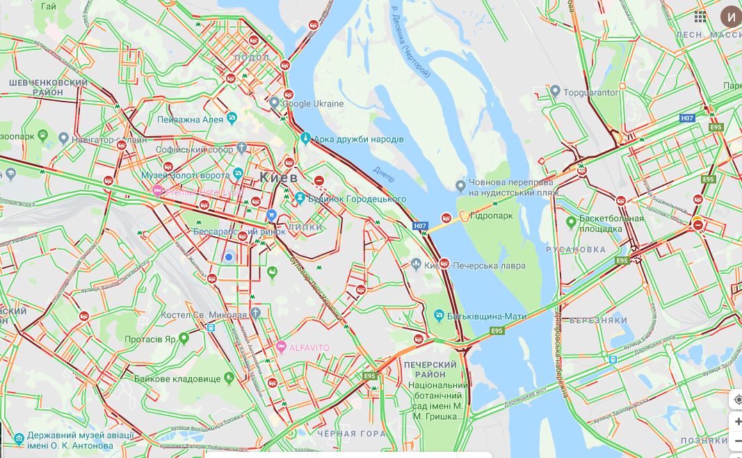 18 сентября Киев сковали масштабные автопробки - преимущественно на правом берегу. Об этом свидетельствуют данные Google maps.