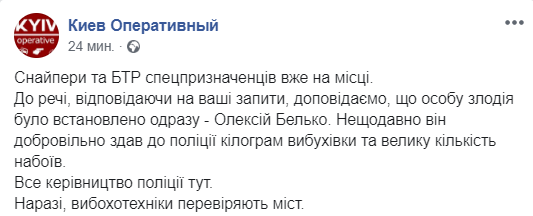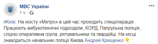 Кроме того, как сообщили в МВД, на мосту Метро в данный момент проводится спецоперация. Работают взрывотехнические подразделения, КОРД, Патрульная полиция, следственно-оперативная группа, спасатели и гвардейцы. Также на месте находится глава полиции столицы Андрей Крищенко.
