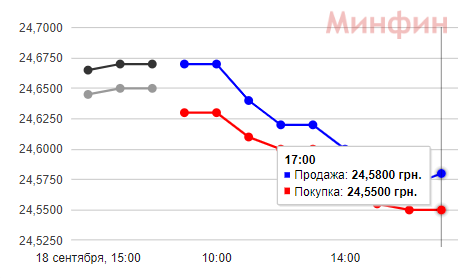 По состоянию на 17:09 доллар показал следующие котировки: 24,55 грн - покупка и 24,60 грн - продажа. За день доллар снизился на 8-9 копеек.