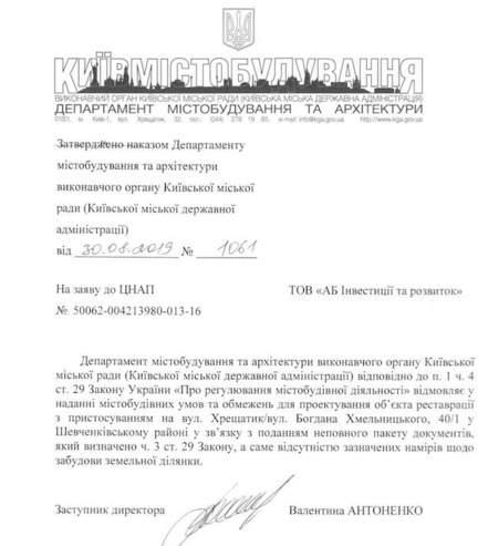 В Департаменте градостроительства и архитектуры КГГА отказали проекту реставрации здания Центрального гастронома из-за представления неполного пакета документов, а именно "отсутствия указанных намерений относительно земельной застройки участка". Об этом сообщает Архитектурно-конструкторское бюро "Вихарев" в Facebook.