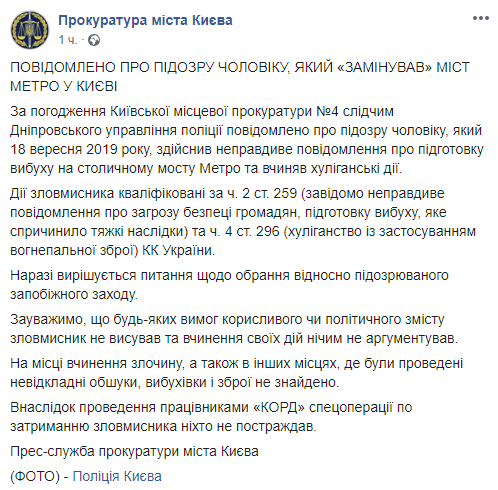 Экс-атошнику Алексею Белько, который вечером 18 сентября под действием наркотиков угрожал взорвать мост Метро в Киеве, сообщили о подозрении. Об этом сообщает  прокуратуры Киева на своей странице в соцсети.
