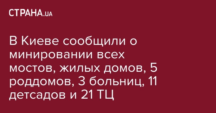 В Киеве сообщили о минировании всех мостов, жилых домов, 5 роддомов, 3 больниц, 11 детсадов и 21 ТЦ