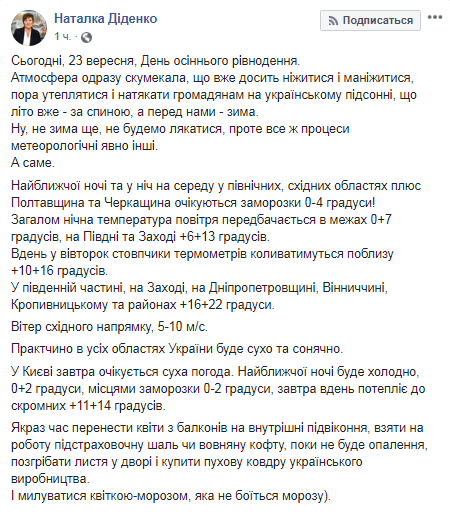 "Сегодня, 23 сентября, День осеннего равноденствия. Атмосфера сразу скумекала, что уже достаточно нежиться и манежиться, пора утепляться и намекать гражданам на украинском солнцепеке, что лето уже - за спиной, а перед нами - зима. Ну, не зима еще, не станем бояться, но все же процессы метеорологические явно другие", - написала Наталья Диденко.