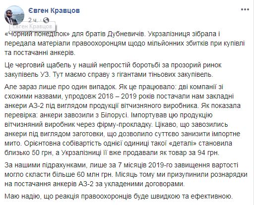 "Черный понедельник" для братьев Дубневичей. Укрзализныця собрала и передала материалы работникам правоохранительных органов о миллионных убытках при покупке и поставке анкеров. Это очередная ступень в нашей непростой борьбе за прозрачный рынок закупок УЗ. Здесь имеем дело с гигантами теневых закупок", - написал Кравцов.