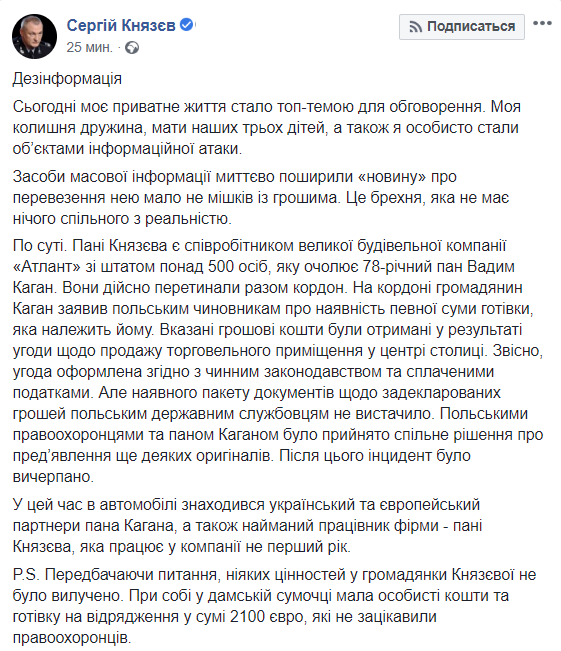 "Госпожа Князева является сотрудником крупной строительной компании «Атлант» со штатом более 500 человек, которую возглавляет 78-летний Вадим Каган. Они действительно пересекали вместе границу. На границе гражданин Каган заявил польским чиновникам о наличии определенной суммы наличности, которая принадлежит ему", - написал Князев.