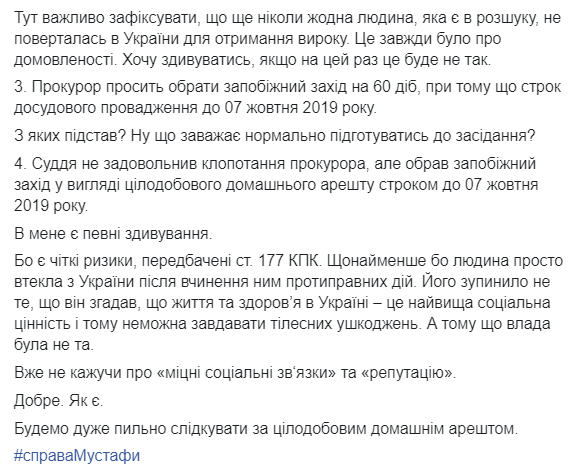 "Судья не удовлетворил ходатайство прокурора, но избрал меру пресечения в виде круглосуточного домашнего ареста сроком до 7 октября 2019 года", - написал он.