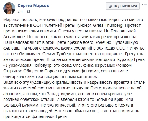 Российский политолог Сергей Марков заявил, что Грета Тунберг - проект Сороса. И сравнивает ее речь с экспрессией комсомольских собраний в СССР.