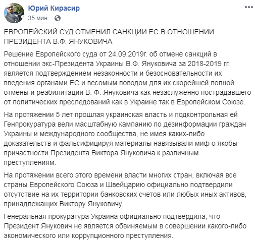 "Решение Европейского суда от 24 сентября 2019 г об отмене санкций в отношении экс-президента Украины Виктора Януковича за 2018-2019 гг является подтверждением незаконности и безосновательности их введения органами ЕС и весомым поводом для их скорейшей полной отмены и реабилитации В.Ф.Януковича как незаслуженно пострадавшего от политических преследований как в Украине так в Европейском Союзе", - отмечается в опубликованном сообщении. При этом он не уточнил, какой именно Европейский суд принял такое решение.