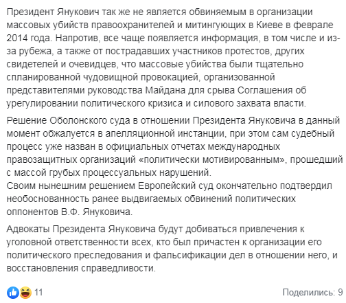 "Адвокаты президента Януковича будут добиваться привлечения к уголовной ответственности всех, кто был причастен к организации его политического преследования и фальсификации дел в отношении него, и восстановления справедливости", - отмечается на фб-странице.